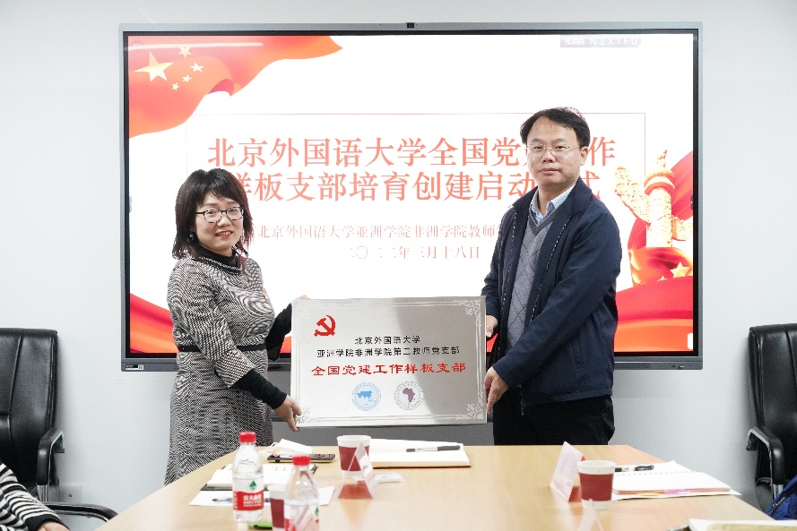 非洲学院教师第二党支部授牌,勉励支部党员在党建和学科建设深度融合的道路上继续前进。