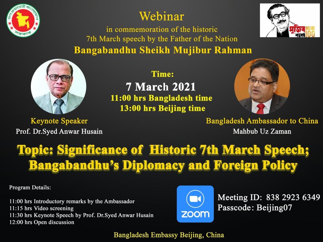 2021年是孟加拉国独立50周年,同时也是孟加拉国国父穆吉布诞辰百年,孟加拉国驻华大使馆借此机会举办了纪念穆吉布“3月7日历史性讲话”的线上活动暨研讨会研讨会,活动有来自中国和孟加拉国的共160多人出席。亚洲色情网
