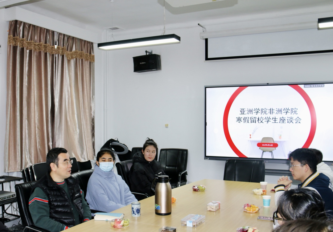 非洲学院在主楼344会议室召开寒假留校学生座谈会。学院党总支书记许晔出席座谈会并讲话,辅导员朱方方和9名留校学生参与座谈会。