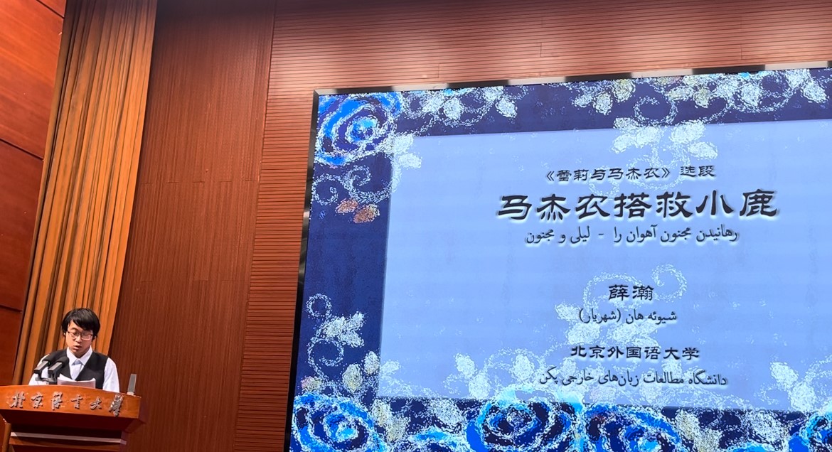 波斯语专业本科生张艺凡、地区研究专业研究生薛瀚作为代表参加了本次朗诵会,张艺凡同学朗诵了《霍斯陆和席琳》选段《霍斯陆与席琳郊游娱乐与歌颂春天》,薛瀚同学朗诵了《蕾莉与马杰农》选段《马杰农搭救小鹿》。两位同学熟练的朗读得到了全场的肯定与热烈的掌声,出色地展示了我校高水平、高质量波斯语教学的成果。