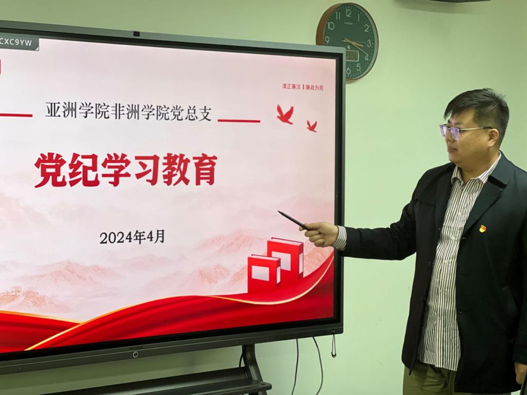 、非洲学院组织员赵磊介绍党总支党纪学习教育的具体安排,并逐条解读了新修订的《中国共产党纪律处分条例》。此次《条例》的修订全面贯彻习近平新时代中国特色社会主义思想和党的二十大精神,新增16条、修改76条,将党的十八大以来全面从严治党发现的新情况、新问题,总结的新经验、新成果及时写入条例,进一步严明政治纪律和政治规矩,教育引导党员干部学纪、知纪、明纪、守纪,始终做到忠诚干净担当,为以中国式现代化全面推进强国建设、民族复兴伟业提供坚强纪律保障。