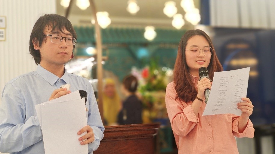 西亚地区研究方向研究生薛瀚、贾文婷作为代表参加朗诵,分别朗诵了《蔷薇园》第二章“智者的品行”的第40、41节。两位同学流利、富有感情的朗诵得到了全场肯定和热烈掌声,充分展现了我院学生风采。