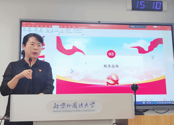 院长苏莹莹强调教师是立教之本,兴教之源,只有教师自身具备理想信念、道德情操、扎实学识、仁爱之心,才能更有效地指导学生成长成才。苏莹莹院长号召全体教职工牢记服务国家战略使命,以更高的标准和责任感,以“四有”好老师的标准严格要求自己,将立德树人根本任务落实到日常的教学和科研工作中,为培养具有家国情怀,国际视野和专业本领的优秀人才贡献力量。