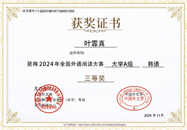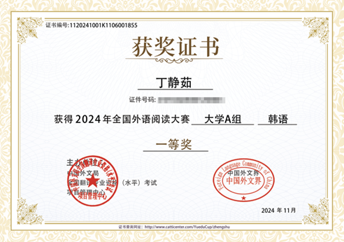 本次赛事设一、二、三等奖和优秀奖,一、二、三等奖获奖比例为参赛人数的30%左右,因此竞争十分激烈。我校朝鲜语专业2021级本科丁静茹同学凭借着扎实的韩语功底,在众多选手中脱颖而出,获得2024年第二届全国外语阅读大赛全国一等奖。此外,2022级本科金晓蕾、侯霁云、叶霏真三位同学获得全国三等奖,朝鲜语专业教师魏国峰、具滋元、齐晓峰三位老师获得优秀指导教师奖。