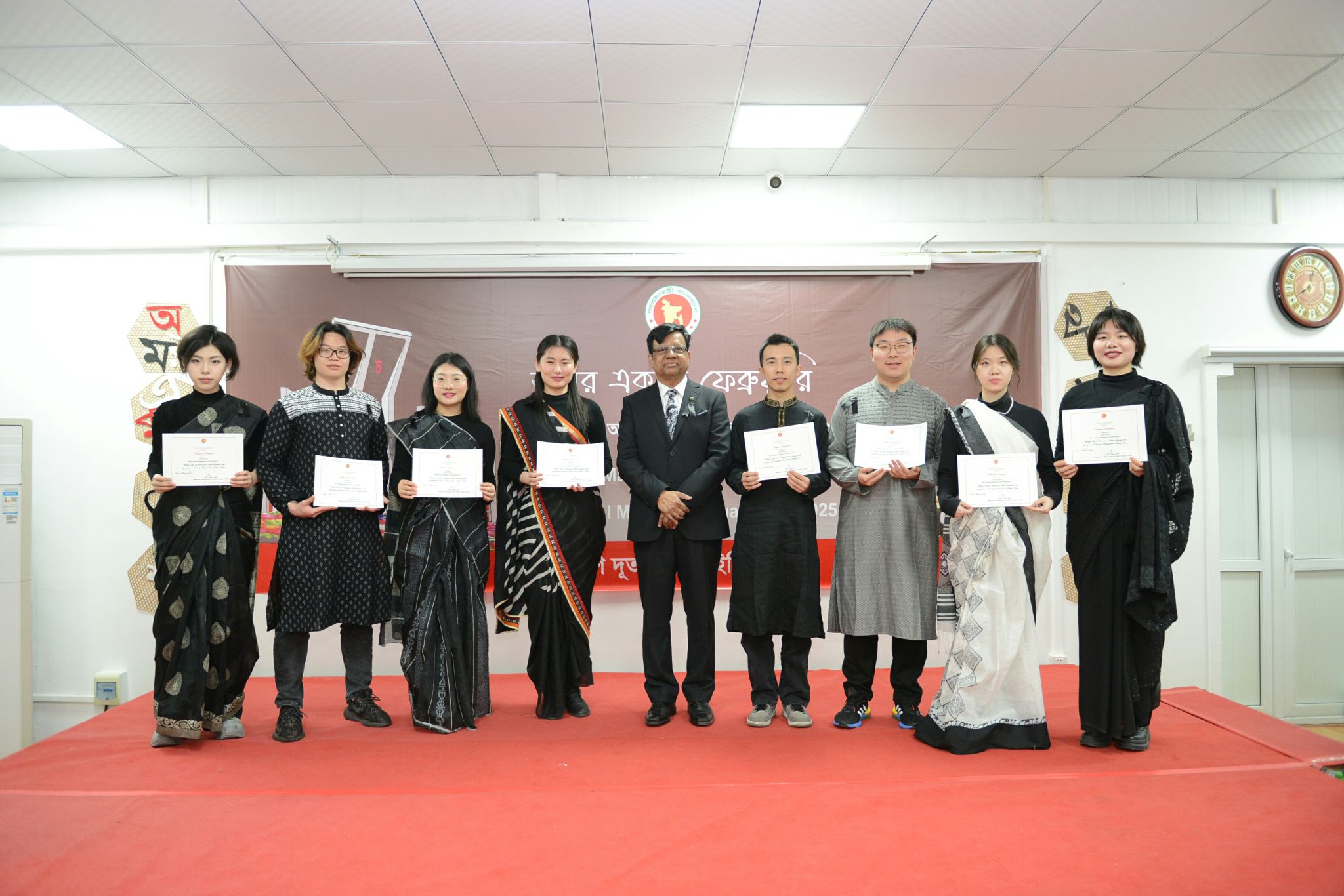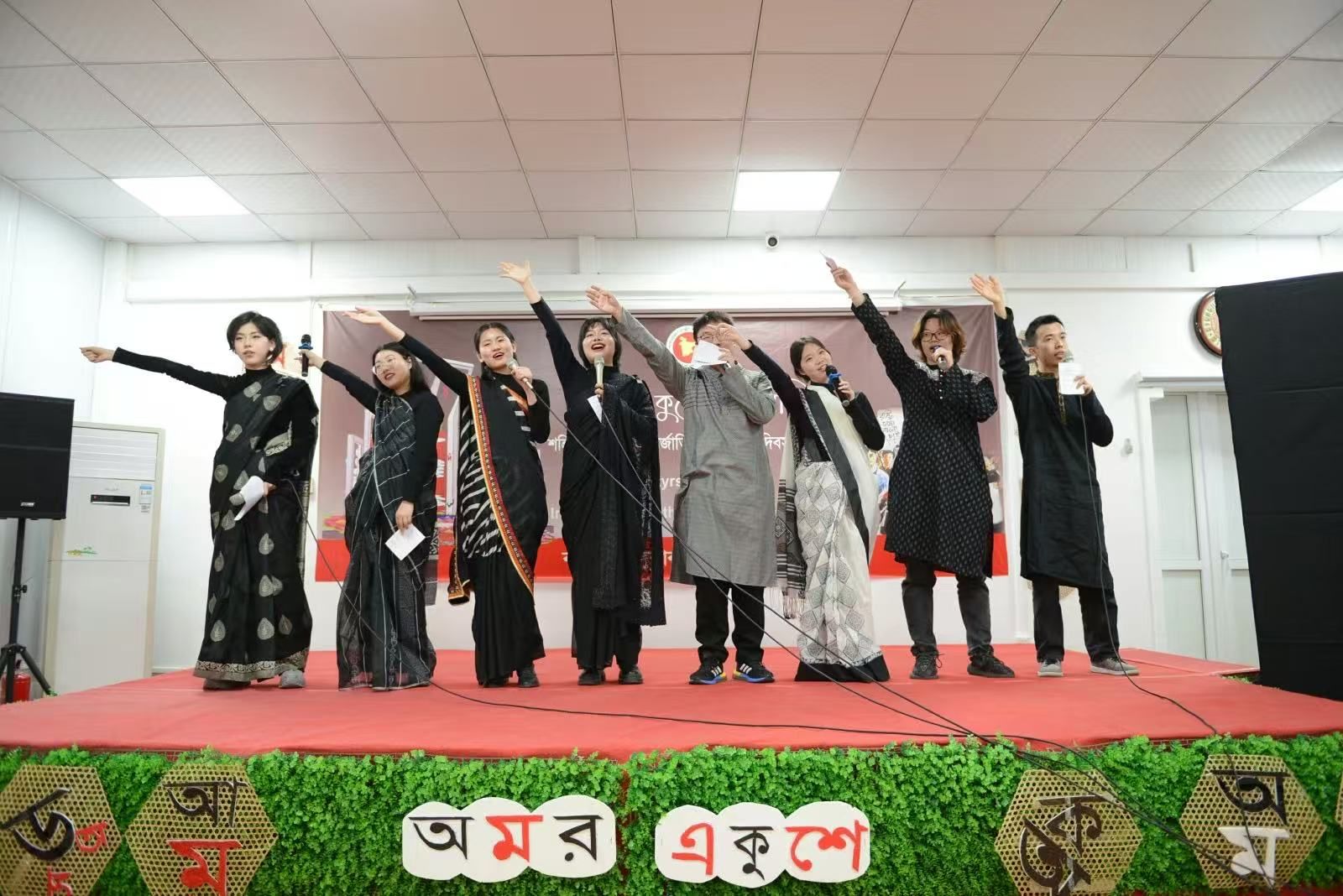 孟加拉语专业学生带来精彩表演。研究生李源毓、朱美澄,本科生张千扬、张丹妮、崔洛宾、赵澜清、王佳亿、杨潇然演唱了孟加拉语歌曲《我以孟加拉语歌唱》(Ami Banglay Gaan Gai)以及中孟双语版歌曲《一起向未来》,节目演出反响热烈。最后,使馆向参演学生颁发表演证书,以资表彰和感谢。